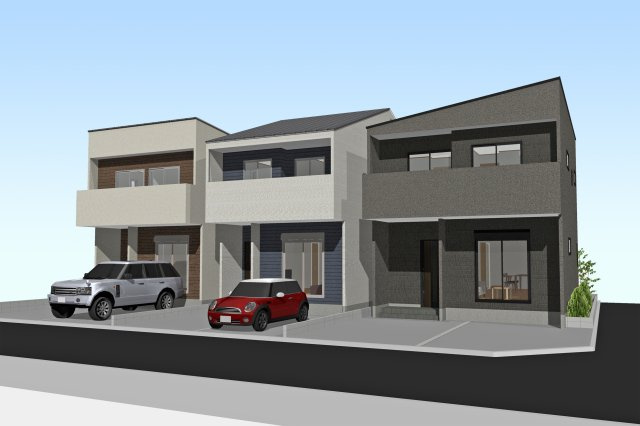 【外観パース】完成予想パース図 左から1号棟、2号棟、3号棟